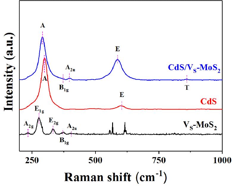 通过拉曼光谱图(卓立汉光自主研制的Finder 930全自动化拉曼光谱分析系统检测)可知, CdS 在300cm-1、601 cm-1和900 cm-1处的拉曼峰归属于A、 E 和 T 振动模式。VS-MoS2在234 cm-1,278 cm-1,334 cm-1,373 cm-1和404 cm-1的拉曼峰归属于 D6h 点群的 A2g, E1g, E2g, B1g, 和A2u 振动模式。此外,由于 CdS 与 VS-MoS2的相互作用,CdS/ VS-MoS2拉曼峰发生蓝移现象。