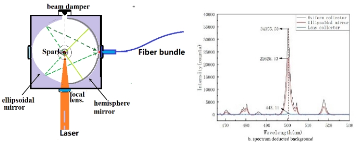 为弥补常规LIPS装置探测限和应用需求的鸿沟,研究团队系统地对颗粒物等离子体激光激发过程、等离子体闪光收集过程和数据处理过程进行了分析和平衡。利用颗粒物和气体分子运动惯量的差异建立了颗粒物气溶胶的空气动力学聚焦系统,将激光与气流相互作用区域的颗粒数密度提升了两个数量级,从而有效提升了激光脉冲在单位时间激发颗粒物等离子体的概率,缩短了测量周期(图5)[3]。同时设计了一个封闭的等离子体闪光收集腔以提升系统的光信号几何收集效率,预期光谱强度可以提升50倍。实际上,由于腔体对等离子体的约束效应,原子谱线的强度提升了近两个数量级(图6)[4]。