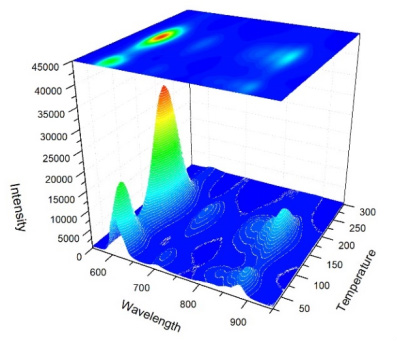 下图为一种无机长余辉发光材料的热释光三维光谱以及热释光温度谱。温度变化范围为 24℃ ~300℃,升温的速率为50℃ / 分钟。该样品在 613.5nm 处有最强的发光峰,(b) 图为从热释光三维光谱(a)中切片截取得到的热释光—温度谱线,其峰值对应的温度 Tm=163℃。