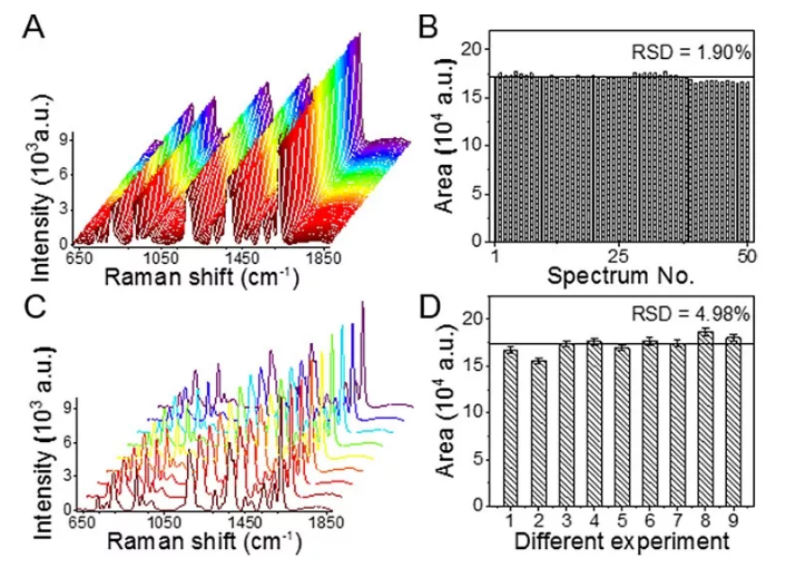 与传统静态固相和静态液相测量方法相比,动态流体SERS平台通过对模型分子的表征,分别以1.90%和4.98%的相对标准偏差展现了良好的稳定性和重复性。