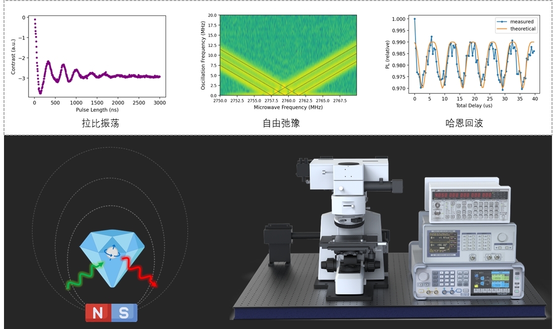 北京卓立汉光仪器有限公司推出的基于NV色心的Finder-NV光探测磁共振(ODMR)测试系统可在CW-ODMR和Pulsed-ODMR之间切换。在CW-ODMR模式下,可测试NV色心在磁场下的塞曼分裂,实现高空间分辨率下高灵敏度探测弱磁场信号;而纵向零场劈裂的大小受温度变化影响极大,NV色心可作为温度传感器感应温度变化。在Pulsed-ODMR模式中,通过对电子自旋施加动力学解耦脉冲序列(Dynamical Decoupling)进行量子操控,可测试NV色心中的拉比振荡(Rabi Oscillations),哈恩回波(Spin Echo),自由弛豫衰减(Free Precession)等过程。
