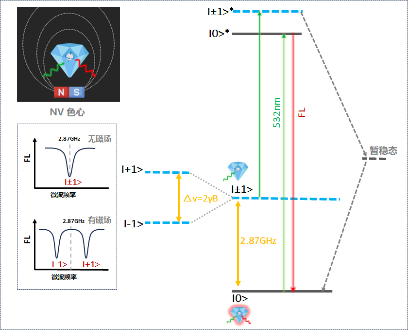 NV色心中的电子有三种自旋状态,可以用符号表示为|0〉、|+1〉和|-1〉。我们可以将其简单理解为这是电子旋转的三种“姿态”,对应三个能级,或者称为三个量子态。当用一束特定波长的绿光去照射NV色心的时候,能把色心中的电子全部初始化到|0〉态。在|0〉态,NV色心会以辐射发光的方式释放激发态能量,发出红色荧光,NV色心处于亮态。如果此时对NV色心施加微波场,当微波频率与 NV电子自旋跃迁能级差相等时,就会发生共振,NV色心便从|0〉 态跃迁到|+1〉和|-1〉态,这时处于激发态的电子要经过系间窜越过程,先到达暂稳态后退激返回基态,此过程不会辐射发光,因此会检测到荧光计数下降,NV色心处于暗态。由于NV色心荧光具有自旋依赖性,我们可以用激光来探测NV色心电子顺磁共振信号,该方法也被称为光探测磁共振(Optically Detected Magnetic Resonance,ODMR)