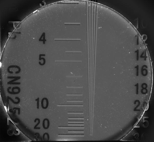 线对是摄像领域中表示分辨率的专用名词,指成像平面1毫米内能分辨的黑白线对数量,单位记作lp/mm,能分辨的线对数越多,则表明成像分辨率越高。图3为OmniFluo960-XrayP 使用商用闪烁体YAG:Ce对分辨率卡进行成像的结果。图中可看到,该闪烁体成像分辨率可达到30lp/mm,成像性能优异。