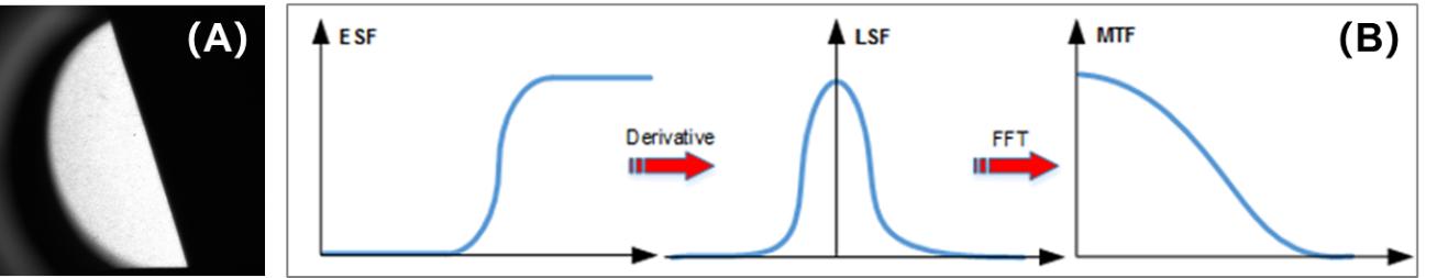 图4. (A)Pb片边缘成像(OmniFluo960-XrayP拍摄);(B)MTF算法流程
