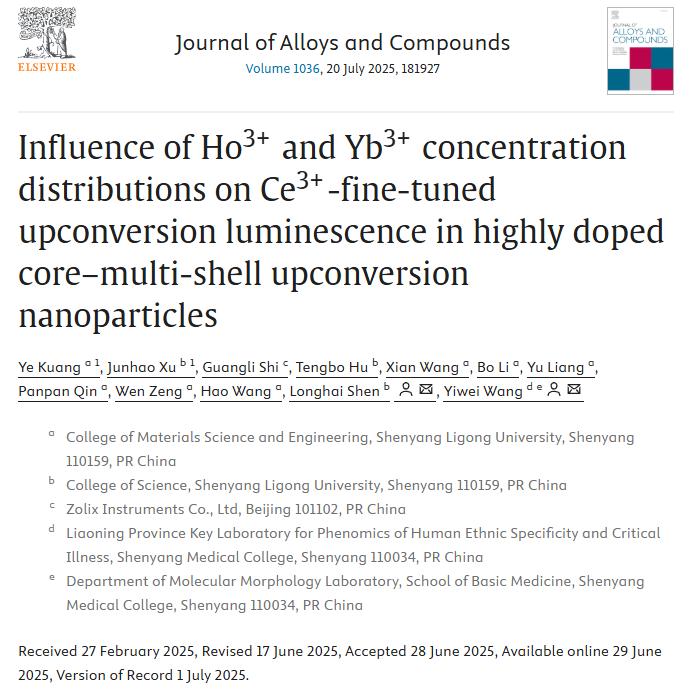 近日,沈阳理工大学沈龙海教授团队在高掺杂上转换纳米粒子(UCNPs)的荧光调变领域取得重要进展。研究成果以“Influence of Ho3+ and Yb3+ Concentration Distributions on Ce3+-Fine-Tuned Upconversion Luminescence in Highly Doped Core–Multi-Shell Upconversion Nanoparticles”为题发表在国际知名期刊《Journal of Alloys and Compounds》上。沈阳理工大学为该论文第一单位,材料科学与工程学院教师匡野与理学院研究生徐俊豪为共同第一作者,理学院沈龙海教授与沈阳医学院王一维副教授为共同通讯作者。今天小卓为大家分享该研究成果,希望对您的科学研究或工业应用带来一些灵感和启发。