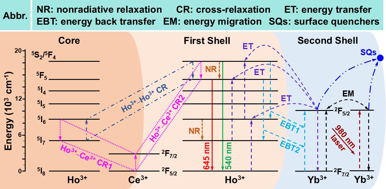 图1. Ce3+掺杂的Ho@Yb UCNPs中的UCL机制。