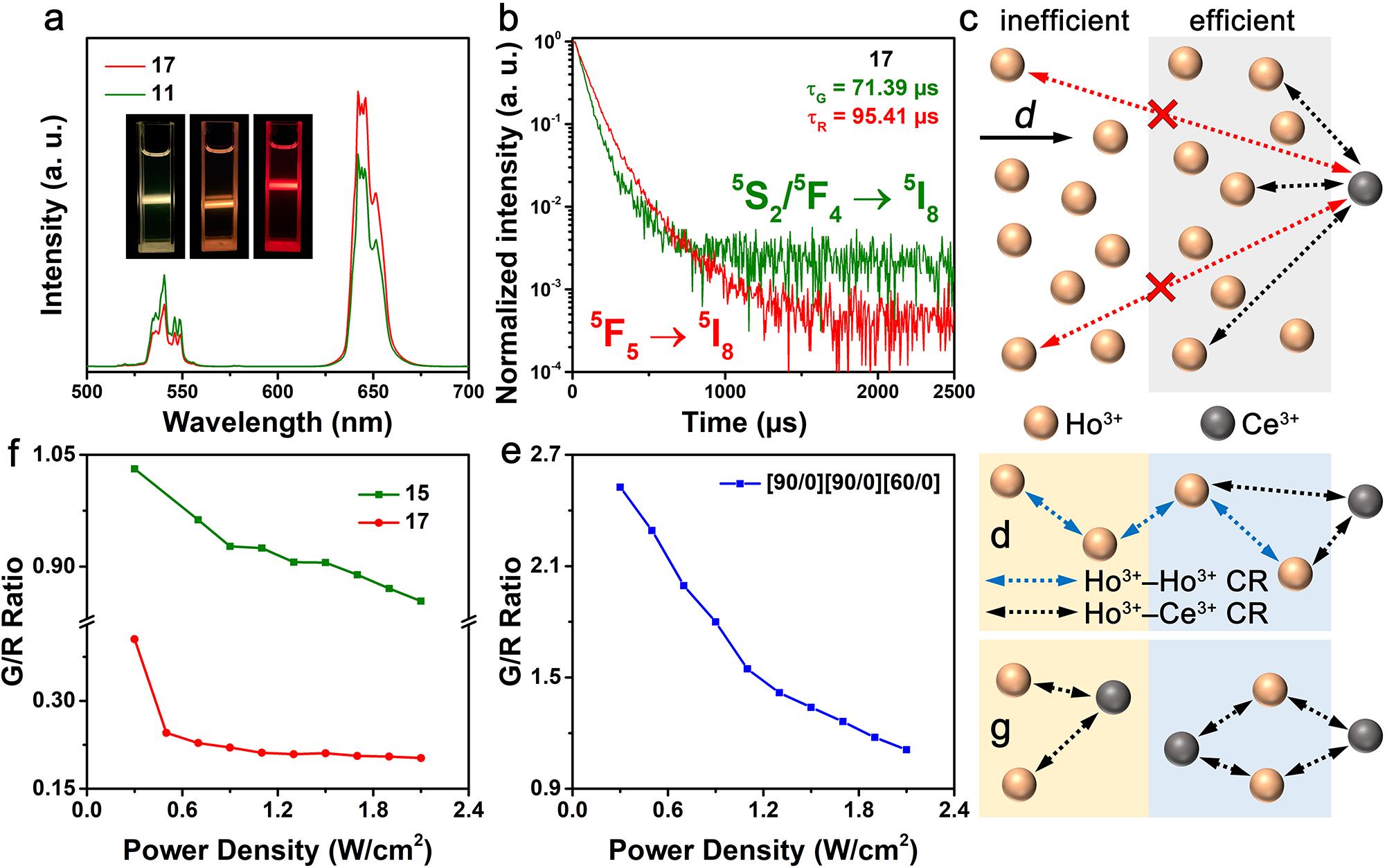 此外,团队还对Ce3+在核壳中的浓度分布影响进行了探究(图4)。经过Ho3+、Yb3+、Ce3+各组分的浓度分布优化,样品具有高钬基红光亮度,且在Ce3+掺杂的同时,绿光红光强度比依旧能够随激发光功率密度上升而下降(图4)。