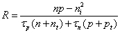 其中,ni为本征电子浓度,tn=1/BnNt, tp=1/BpNt, Bn(p)为电子(空穴)被陷阱态捕获速率,n(p)t为准费米能级与缺陷态能级一致时电子(空穴)浓度。可推知,当陷阱态在带隙中心(如深能级缺陷)时,复合速率*大。而当激发浓度远远低于陷阱态浓度时,其复合速率通常近似为与激发浓度成正比。