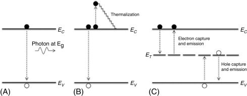 图1、几种常见的复合过程。(a)band-to-band复合,(b)Auger复合,(c)trap-assisted复合。1
