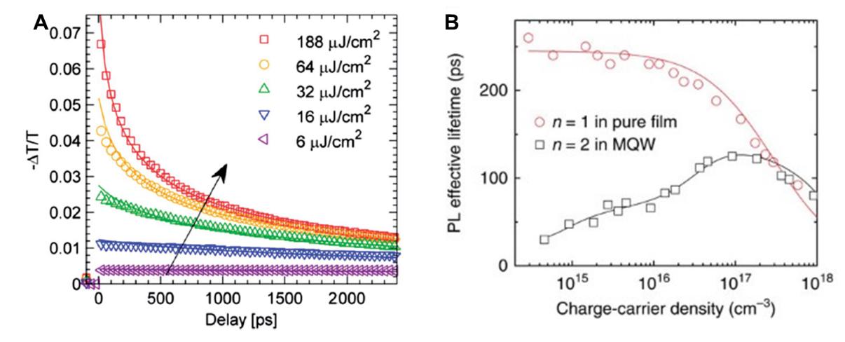 图2、钙钛矿中的复合。(A)基于OPTP测得的MAPbI3-xClx的复合特性。(B)基于TRPL测的钙钛矿多量子阱复合特性。