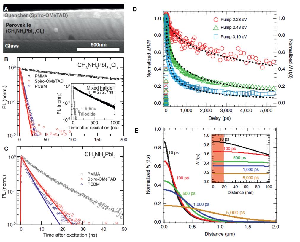 图3、利用TRPL和TA研究钙钛矿薄膜和单晶中载流子输运性质。(A-C)MAPbI3-xClx薄膜覆盖空穴或者电子传输层后荧光动力学的变化。(D-E)不同激发波长测得的MAPbBr3单晶的瞬态吸收动力学。