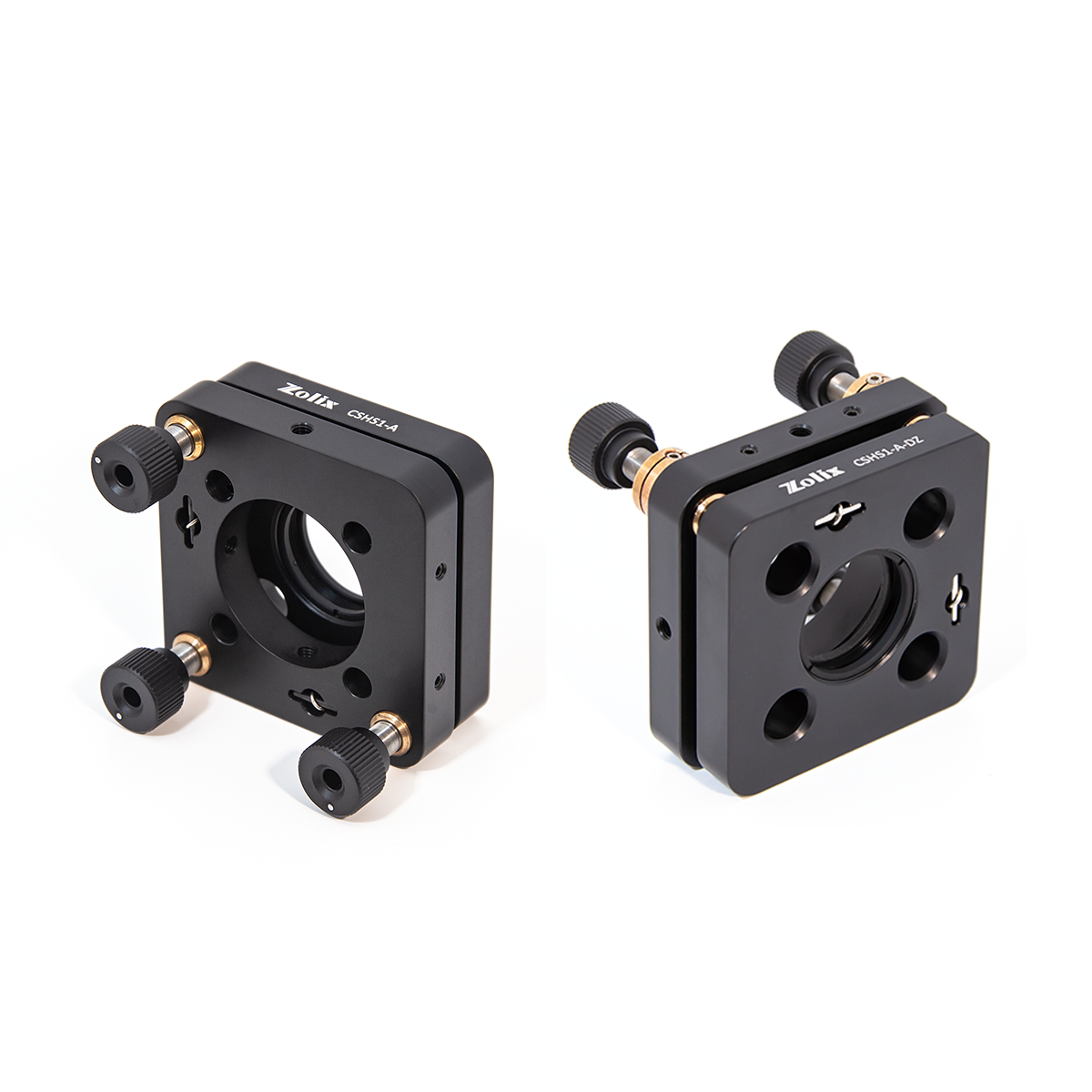 ZOLIX提供的笼式反射镜架可兼容30mm笼式系统也可在自由空间中使用,并可提供左右手安装,适用于Ø25.4mm的光学元件。中心安装孔为SM1螺纹孔,孔内附带2个SM1卡环。笼杆连接通孔处各配有一个位于侧面的锁紧固定螺丝,可使用1.5mm六角扳手紧固,其CSHS1-A-DZ反射镜架调节器提供锁紧功能。