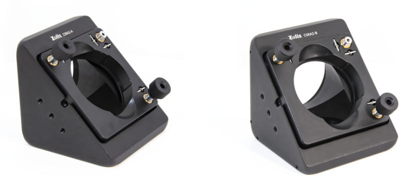 ZOLIX提供的直角调整架兼容30mm笼式系统,适用于直径25.4mm的光学元件。调整架包含两个螺纹调节丝杆,该调节丝杆提供0.95°/转的调节精度,通过调节丝杆可实现±2.5°的角度调节且调整架可沿笼杆进行滑动。光学元件通过胶头螺钉将其固定,光学元件最小厚度为3mm。