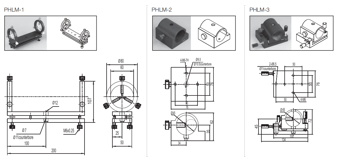 Compare with PHLM-2,PHLM-3 increase adjustment functions along y z axis. ultra-fine teeth screw drive of adjustment constructure,disc spring reset,Iinner hole relative lock tight screw position has concave groove,this is the same with phlm-2,stable and repeatabily .lock tight screw of un-metal material protect laser mounts