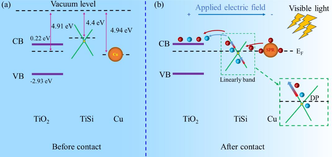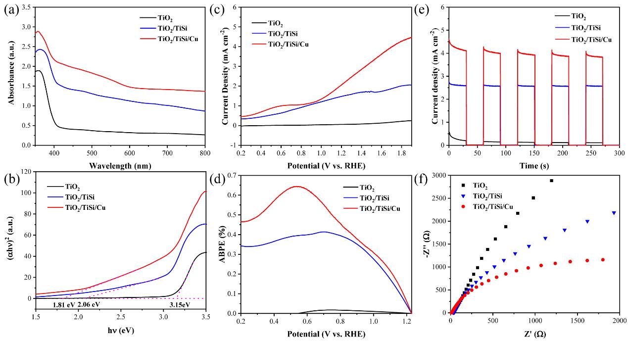 开发高效、稳定的光电催化材料是实现太阳能驱动水分解制氢的关键。湖北工业大学等单位的研究团队结合磁控溅射与真空热蒸发技术,在TiO2纳米棒阵列上依次沉积拓扑半金属TiSi薄膜与等离子体Cu纳米颗粒,构建出TiO2/TiSi/Cu复合光阳极。该结构充分利用TiSi的拓扑线性能带结构作为电子的高速传输通道,协同 Cu的表面等离子体共振(SPR)效应,共同增强光吸收、促进载流子分离与传输、延长载流子寿命,进而显著提升可见光驱动下的光电催化分解水性能。在>420 nm可见光照射下,TiO2/TiSi/Cu光阳极的光电流密度达到纯TiO2的17.84倍,并表现出优异的循环稳定性。这些结果不仅为TiO2基光阳极的性能优化提供了新思路,也为拓扑材料在能源催化领域的应用拓展了新的方向。