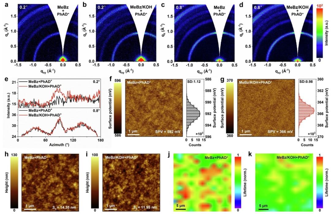基于碱性环境的层间配体交换助力形成更完整的表面配体封端,在光吸收层制备过程中有效防止配体后处理A位配体交换过程对PQD晶格结构的破坏,使基于MeBz/KOH的PQD光吸收层从表面至体相的晶体学取向高度均一(图a-e)。基于MeBz/KOH的PQD固体薄膜的形貌与PL映射分布更加均匀,表明碱性环境下进行层间配体交换有效减轻了光吸收层内相邻PQD的团聚(图f-k)。
