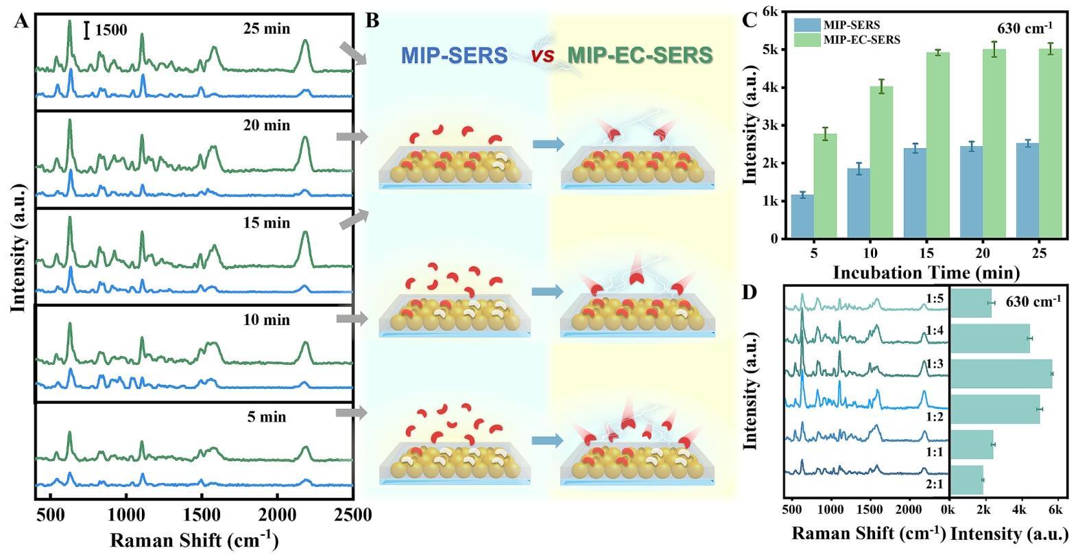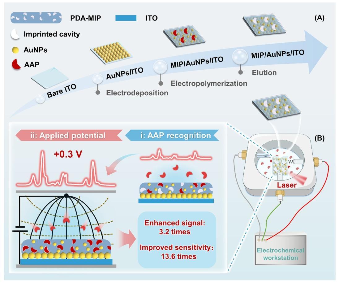 本期用户速递,海南大学食品科学与工程学院“纳米传感与光电分析团队”吴龙教授课题组联合大连工业大学,在《Food Chemistry》发表“ A three-in-one strategy of molecularly imprinted polymers-based electrochemical SERS for sensitive detection of acetamiprid in vegetables”研究论文,提出提出“分子印迹捕获-电化学调控-拉曼信号增强”三合一策略,构建分子印迹聚合物基电化学SERS(MIP-EC-SERS)传感器,重点通过基底设计与检测条件优化,解决传统SERS基质干扰、分子亲和力弱的问题。