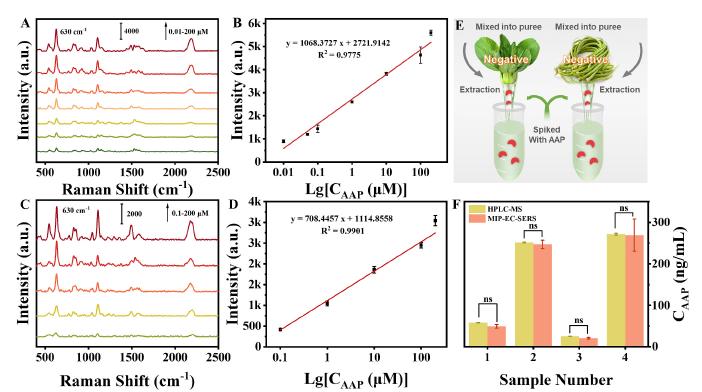 表面增强拉曼散射(SERS)技术凭借对目标分子的独特振动指纹识别能力与高灵敏度,已成为农药残留检测领域的重要工具,其核心原理是通过等离激元纳米材料构建“热点”区域,放大痕量分子的拉曼信号,理论上可实现单分子水平检测。然而,在蔬菜中啶虫脒(AAP,一种广泛使用的新烟碱类农药,残留会威胁人体健康)的实际检测中,SERS技术面临两大关键瓶颈:一是蔬菜基质中的复杂干扰物质会产生背景拉曼信号,掩盖AAP的特征峰,导致检测准确性下降;二是AAP与传统SERS基底的亲和力较弱,难以有效富集到“热点”附近,限制拉曼信号增强效果,无法满足痕量检测需求。