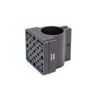 SCR38-A 单点式转接件:接杆套环集成一个 M4 沉头孔与一个 M4 螺纹孔,两孔呈 90° 间隔分布,支持光机械件的垂直安装。套环可沿接杆轴向滑动至目标位置,并通过 M6 胶头螺钉实现稳固锁定。
