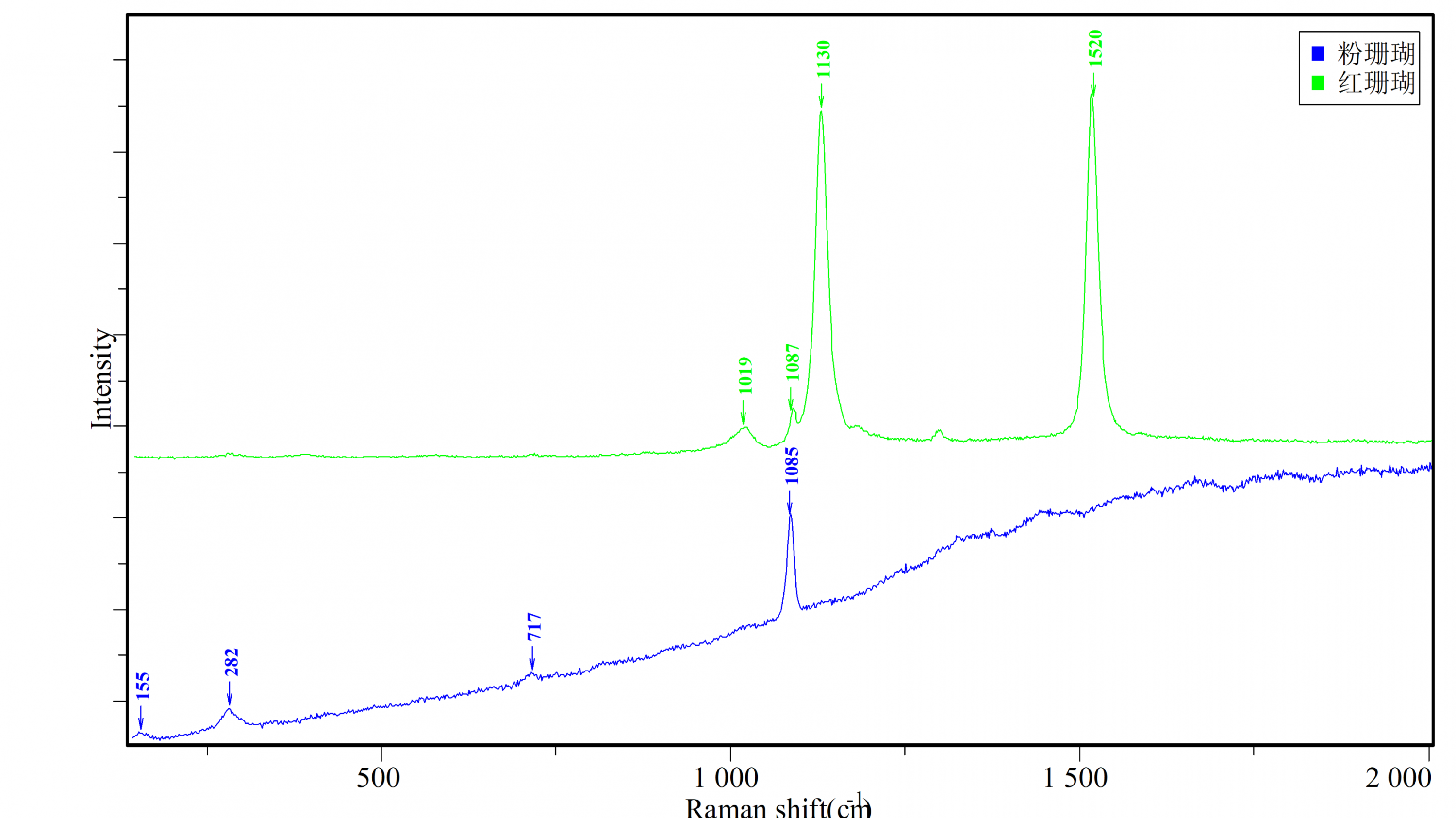 红色、浅粉色红珊瑚的拉曼光谱图如下图所示:
