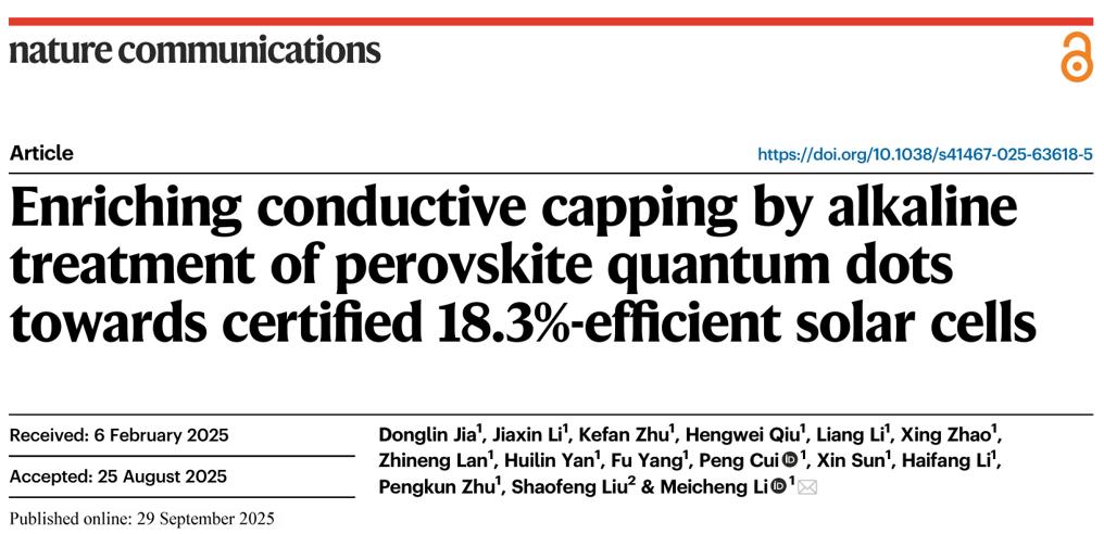 近日,华北电力大学李美成教授团队创新性地开发了“构筑碱性环境增强酯类反溶剂水解“的配体交换方案,所制备0.036 cm2的太阳能电池实现18.3%的认证效率(为已发表量子点太阳能电池*高认证效率),稳态效率达 17.85%。构筑的碱性环境与多种固相处理和PQD组分良好兼容,在调节材料表面化学性质上展现出普适性。相关成果以“Enriching conductive capping by alkaline treatment of perovskite quantum dots towards certified 18.3%-efficient solar cells”为题,发表于Nature Communications 杂志上。