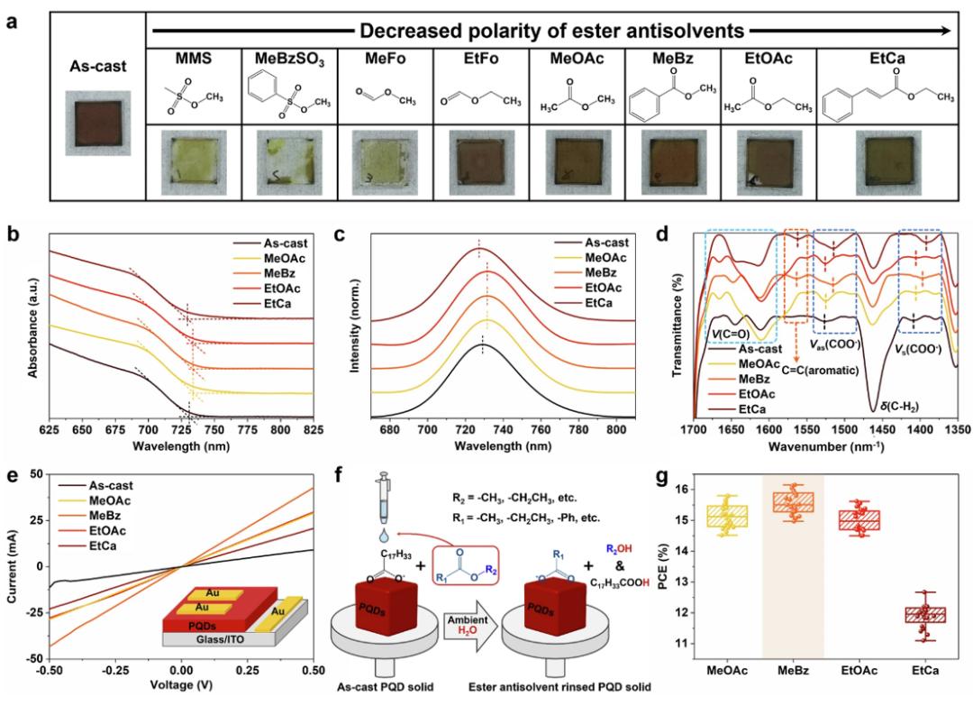 通过探讨极性不同的酯类反溶剂对PQD薄膜形貌、光学性能的影响甄选合适反溶剂。酯类反溶剂水解得到的短配体显著影响PQD薄膜导电性及其器件性能,酰基端带有共轭苯环的MeBz能够水解得到电荷传输性能更佳的苯甲酸根(BZA-)配体,比传统MeOAc更适合作为润洗PQD薄膜的反溶剂(图d-g)。
