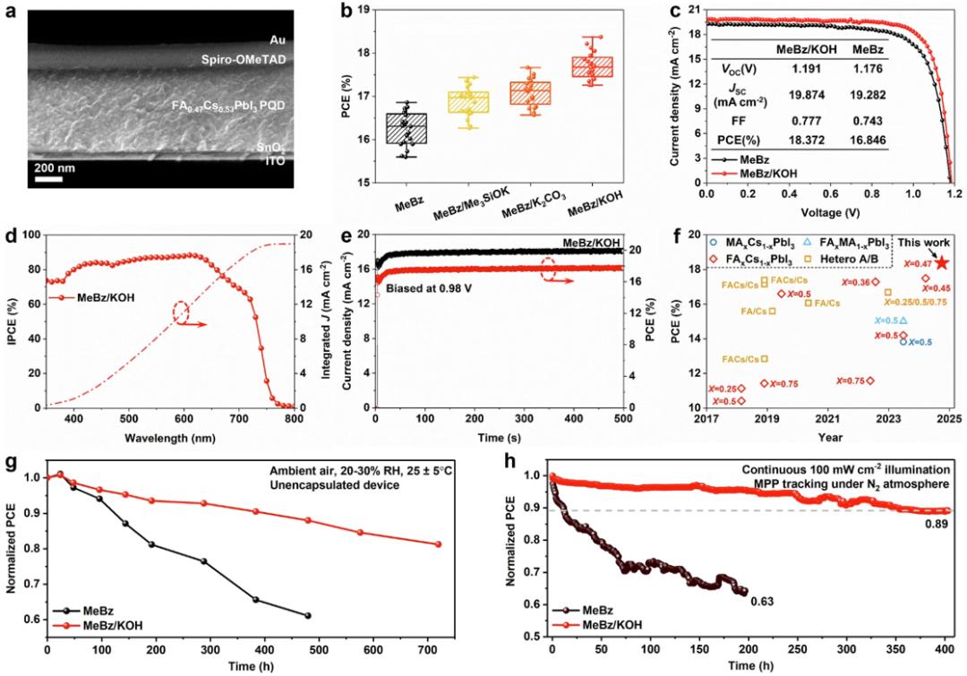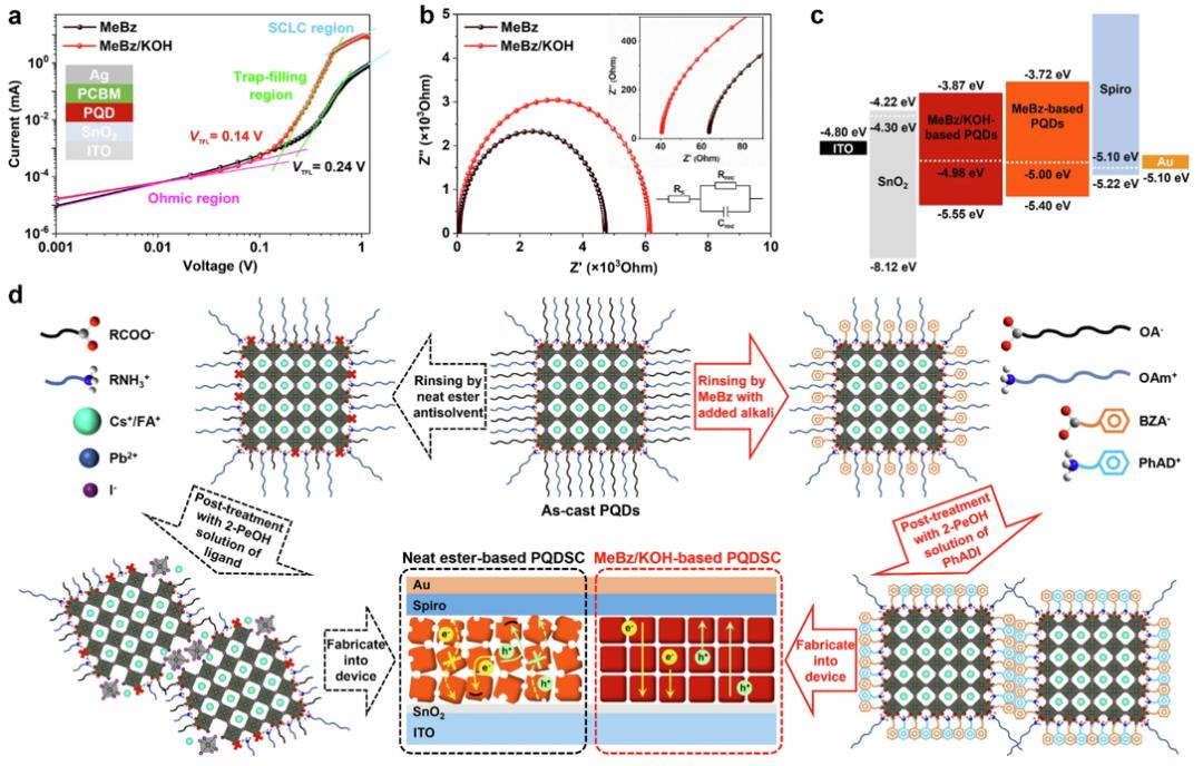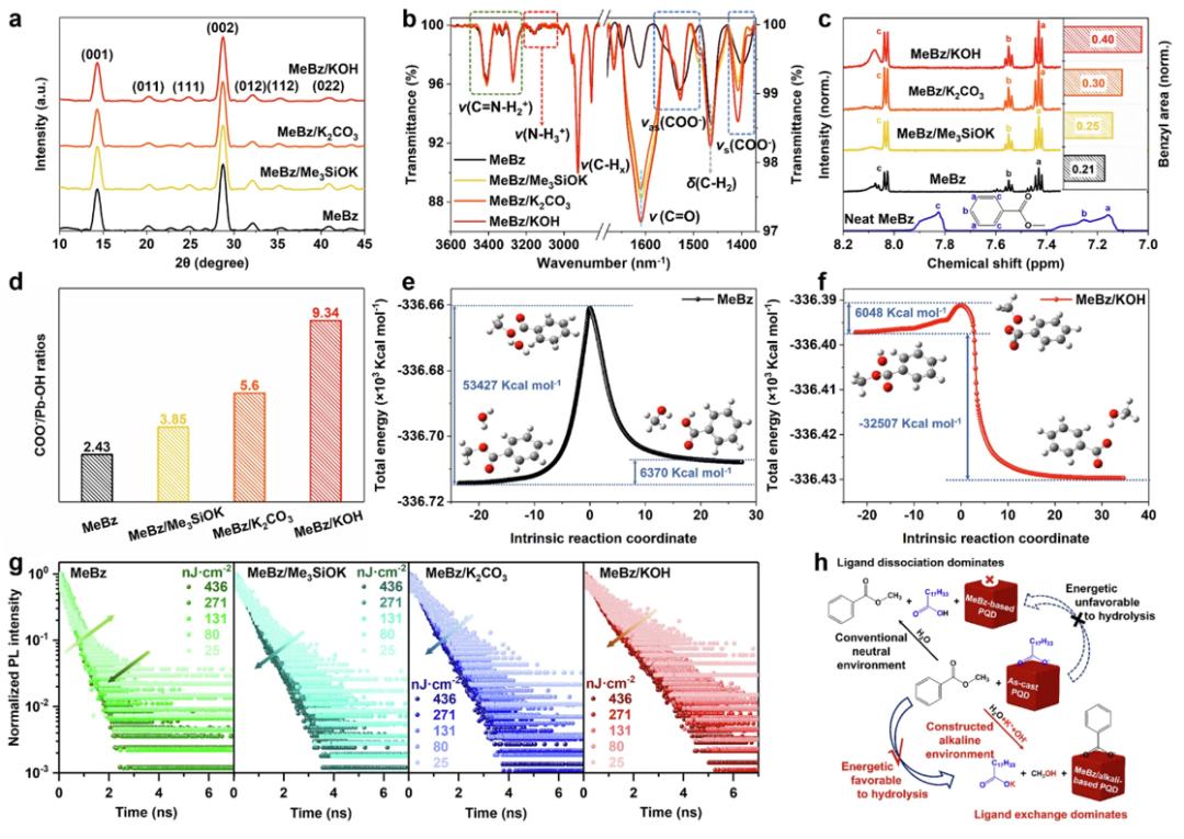采用碱性添加剂促进高效酯类水解用于PQD配体交换;理论计算证实,碱性环境可使酯类水解在室温条件下充分自发进行,并使反应活化能降低约9倍(图e-f)。通过梯度碱度调节构筑适当的碱性环境,确保PQD表面导电封端的完整性,避免形成陷阱态,有效改善材料光电性能(图g-h)。