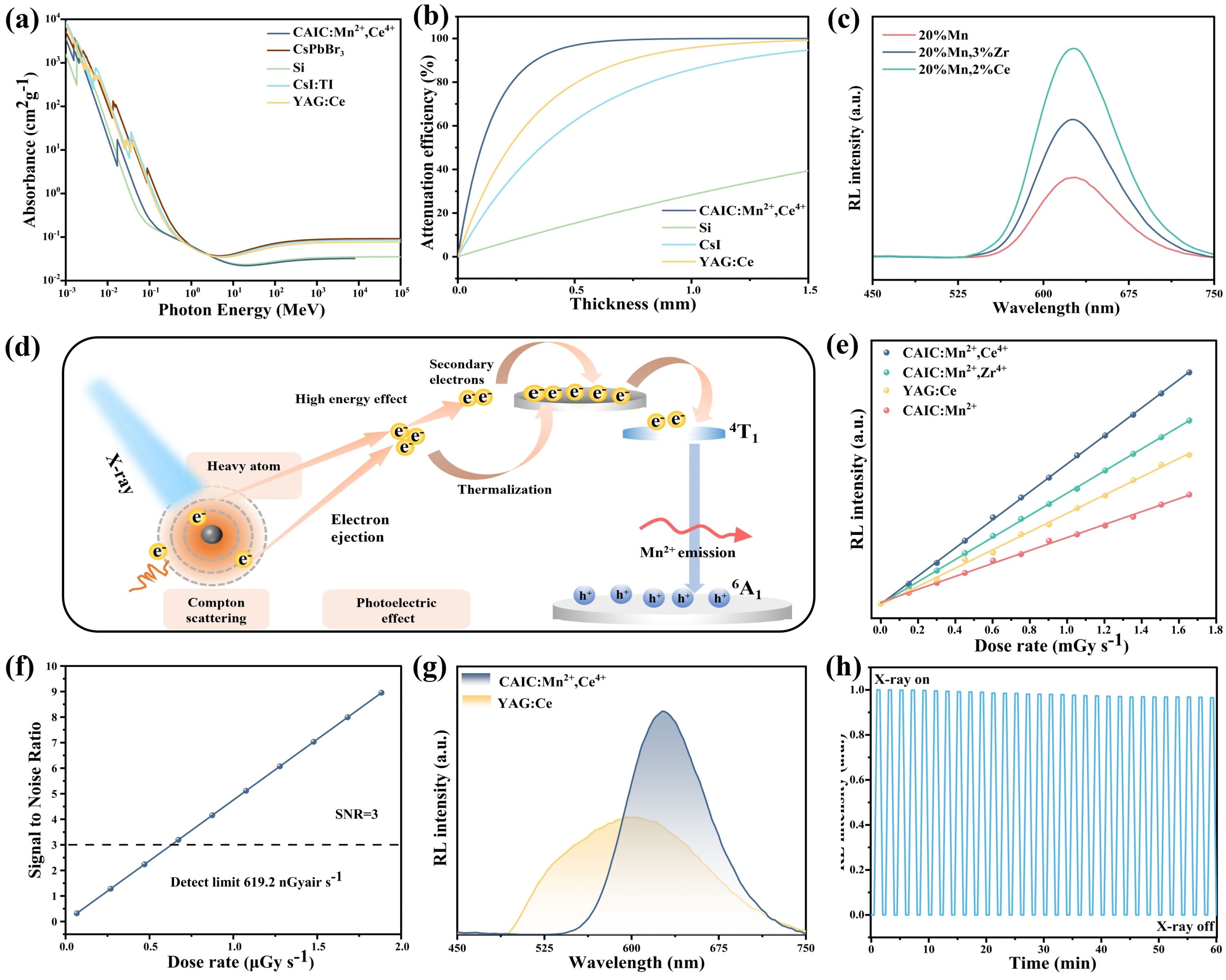 图2(a)CsPbBr3、Si、CsI-TI、YAG:Ce和CAIC:Mn2+, Ce4+对光子能量的线性衰减系数;(b)几种闪烁体在X射线辐射下的衰减效率与厚度的函数关系;(c)CAIC:Mn2+、CAIC:Mn2+, Zr4+与CAIC:Mn2+, Ce4+的辐射发光光谱;(d)提出的辐射发光机理图;(e)CAIC:Mn2+、CAIC:Mn2+, Zr4+、CAIC:Mn2+, Ce4+与YAG:Ce闪烁体的辐射发光强度随X射线剂量率的变化;(f) CAIC:Mn2+, Ce4+的X射线剂量率的变化与信噪比SNR的函数关系;(g)CAIC:Mn2+, Ce4+与YAG:Ce闪烁体的辐射发光光谱;(h)连续30次X射线照射-关闭循环下CAIC:Mn2+, Ce4+的辐射发光强度变化。