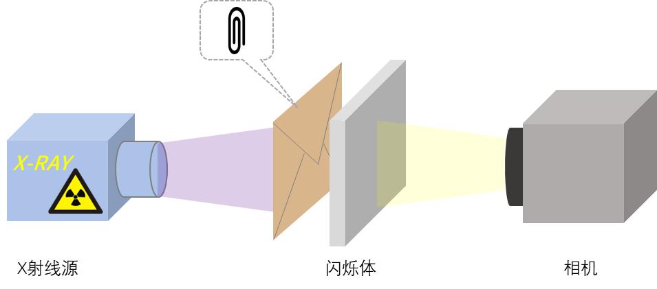 在闪烁体成像测试中,通常采用间接成像的方法。在间接X射线成像中,X射线作为激发辐射源, CMOS相机作为检测器。我们将待成像的样品放置在闪烁体前,经过样品吸收并透射的X射线就会照射到闪烁体上,闪烁体把X射线能量转变成光子释放出来,*后被相机捕捉到样品的成像。