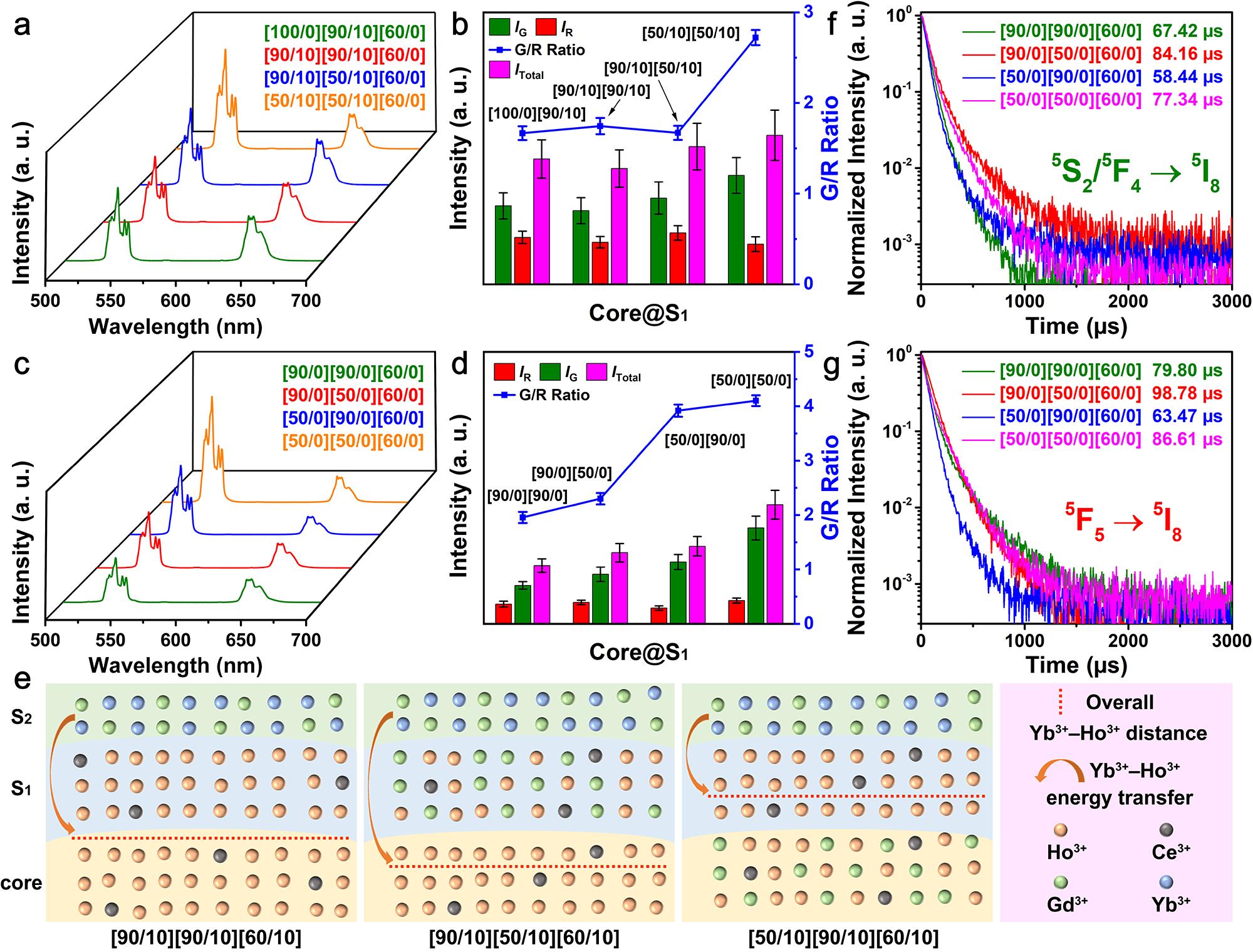 近日,沈龙海教授团队通过含Ce3+组分的NaHoF4:Gd3+@NaGdF4:Yb3+高掺杂多壳层结构(Ho@Yb)UCNPs,探究了敏化剂Yb3+与激活剂Ho3+在核壳中的浓度分布对Ce3+调变钬基荧光的影响(图2、3)。
