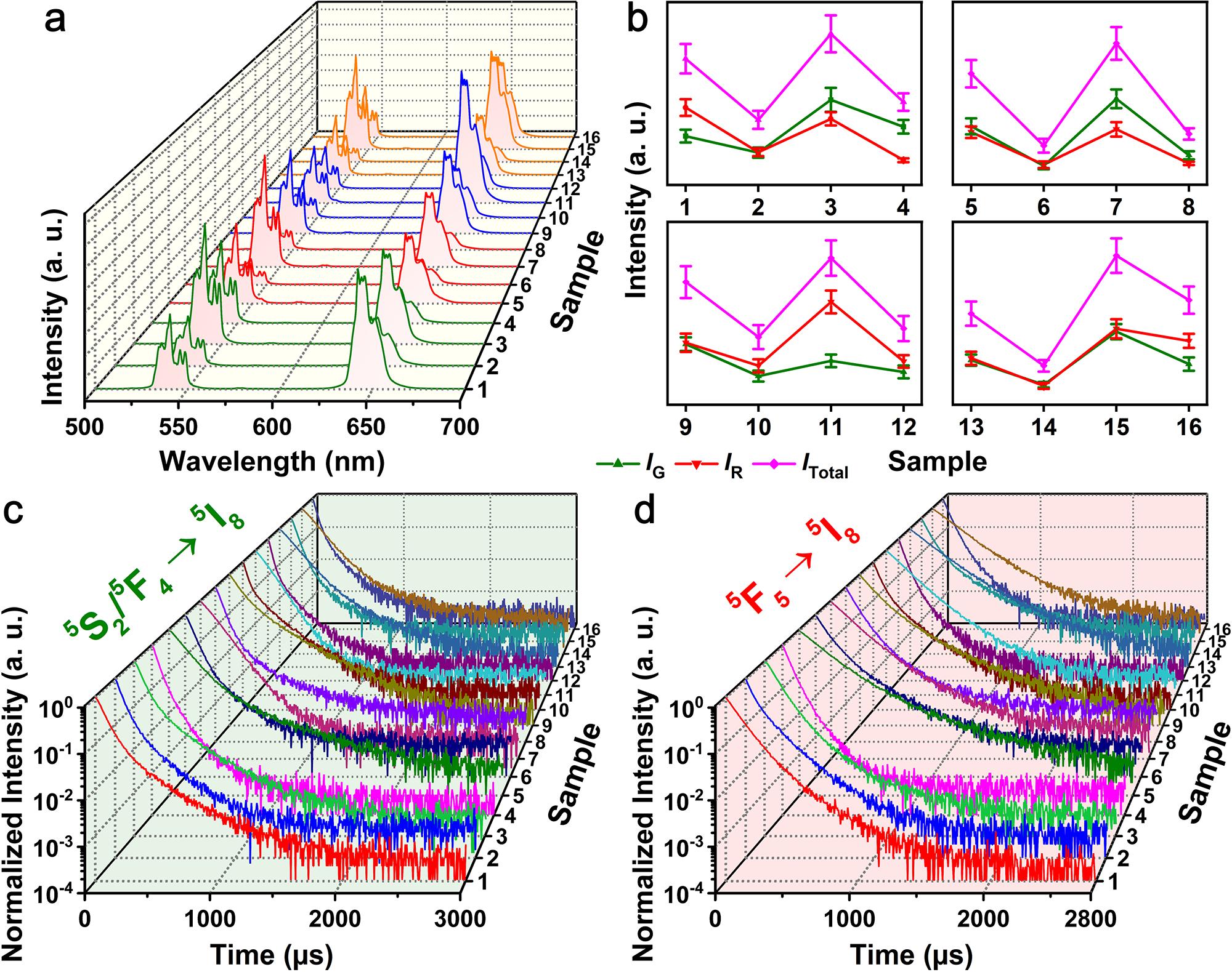 此外,团队还对Ce3+在核壳中的浓度分布影响进行了探究(图4)。经过Ho3+、Yb3+、Ce3+各组分的浓度分布优化,样品具有高钬基红光亮度,且在Ce3+掺杂的同时,绿光红光强度比依旧能够随激发光功率密度上升而下降(图4)。