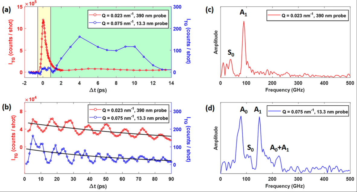 Naumenko等人报告了使用EUV TG测量57 nm厚碳化硅(SiC)薄膜在Q大于1 um-1情况下的机械和热响应[ACS Appl. Nano Mater. 2019, 2: 5132−5139]。SiC是一种重要的第三代半导体材料,可用于新型高功率半导体器件,同时在基础科学和应用科学领域都有广泛的研究。其热响应的特征时间尺度与预期存在较大偏差,这意味着在小尺寸下扩散区可能容易被击穿,因此利用EUV TG对该薄膜进行纳米级热弹性性质进行完整的表征非常重要。从图2中可以看出,接近Δt = 0时光学和 EUV 探针突显了明显的差异。光学探针获得的数据特点是ITG急剧增加,然后快速衰减,具有缓慢的调制;而EUV 探针获得的波形仅在Δt = 0附近显示小的“阶跃状”行为。这是因为光学探测对激发产生的电子空穴对非常敏感,即对EUV TG相互作用突然产生的电子激发的布居光栅非常敏感。而在EUV探测的TG中,折射率变化主要由总电子密度的变化决定,因为EUV 波长远离任何电子-核共振。因此,光学探测的EUV TG实验中观察到的快速电子衰变涉及许多过程:电子-声子耦合、俄歇复合、碰撞电离、扩散、电荷俘获等,对每个过程的动力学评估都需要详细研究。