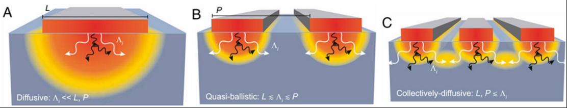 图3 纳米尺度热传输由三个特征尺度决定[PNAS, 2015, 112(16): 4846–4851]:热源尺寸 L、热源间距 P 以及载热声子的 MFP Λi。(A) 当所有 MFP 都小于 L 时,散热完全来自扩散效应。(B) 当 L 收缩时,长 MFP 声子呈弹道状传播,相对于扩散预测,散热速率有所降低,此时短 MFP 声子仍保持扩散性。(C) 当 L 和 P 同时减小,来自相邻热源的长 MFP 声子会像来自单个大型热源一样相互作用,从而实现更高效的扩散式传热。