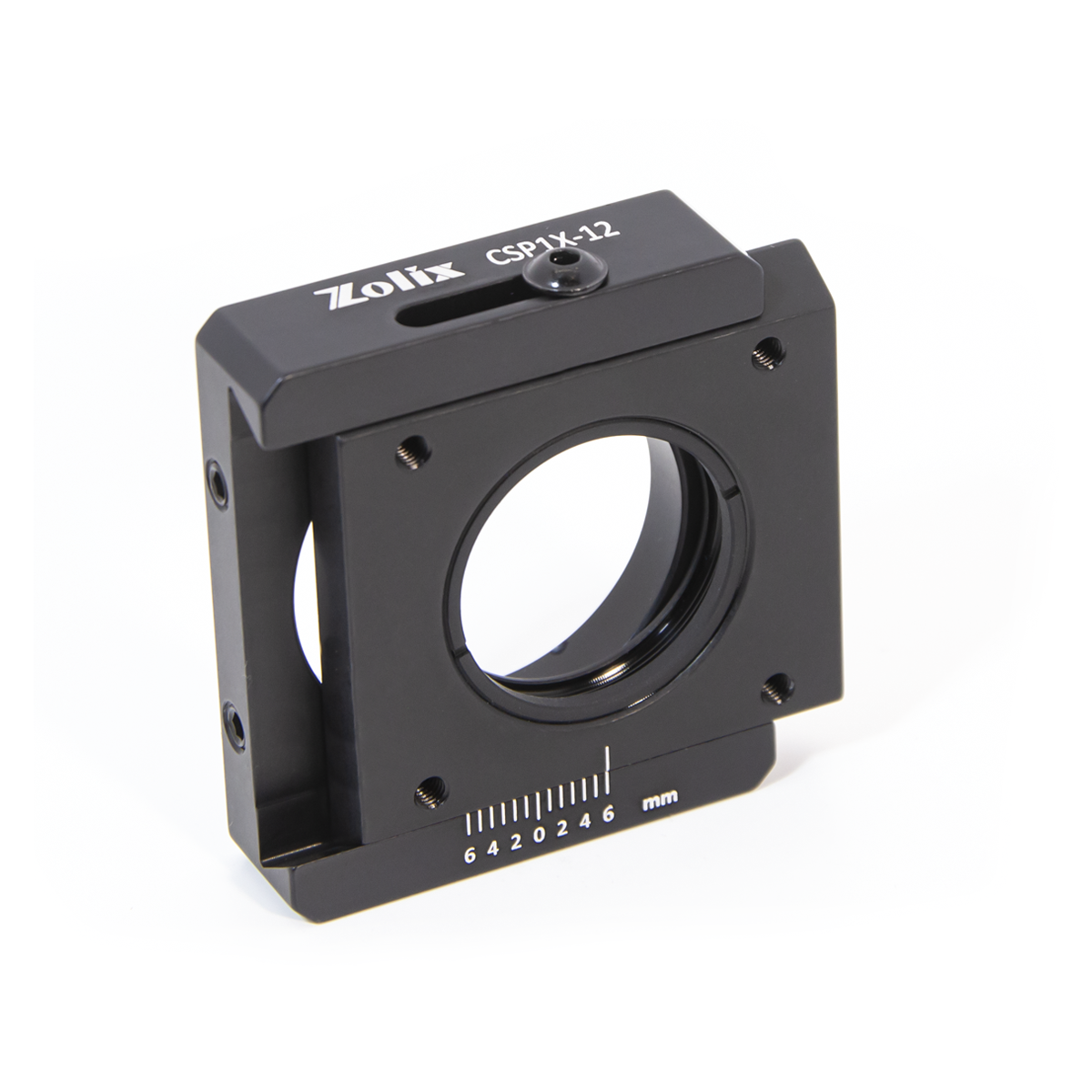 ZOLIX提供的平移式笼板兼容30mm笼式系统,适用于光学元件精密对准。其采用双板联动结构:固定板集成四组笼杆安装盲孔,移动板配置对应螺纹孔;固定板底部中央预置M4支撑接杆接口,确保系统刚性。适配Ø25.4mm光学元件,±6mm大行程调节能力配合正面1mm分度刻度(精度±0.1mm),实现亚毫米级光路校准。