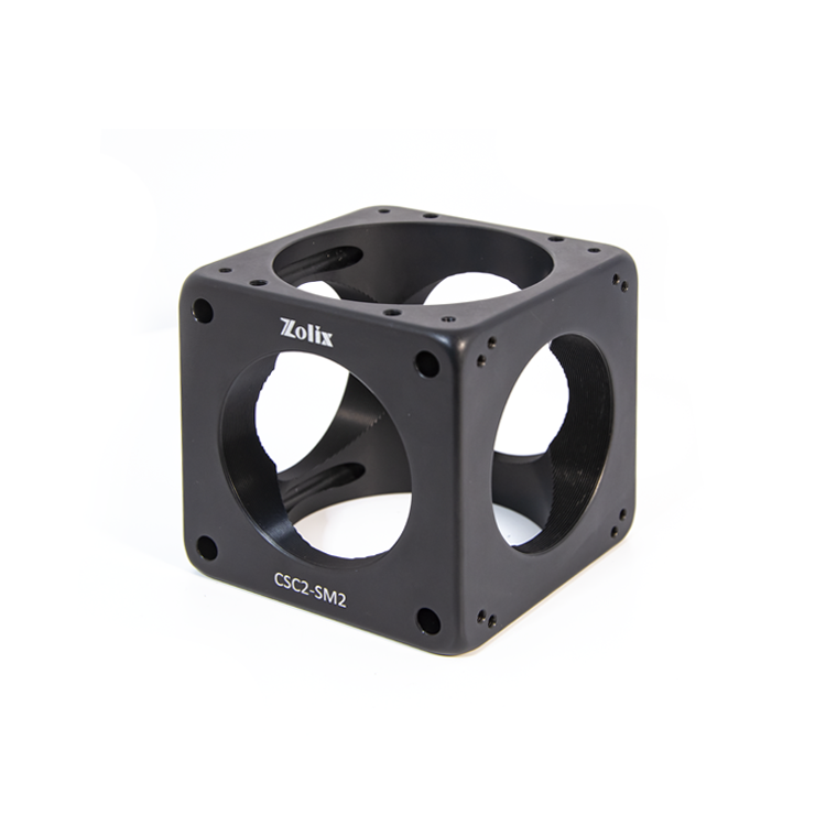 ZOLIX提供60mm笼式立方采用双面Ø6mm通孔,四面M3螺纹孔复合结构,兼容Ø6mm笼杆安装。通孔设计支持笼杆轴向滑动定位,螺纹孔通过螺钉实现笼杆刚性锁紧。需配合CSC2-CP-C盖板与CSC2-CP-D压板形成完整光学元件安装模块,适用于棱镜、分束立方等元件的固定。立方体本体为结构基件,需与其他组件组合使用。