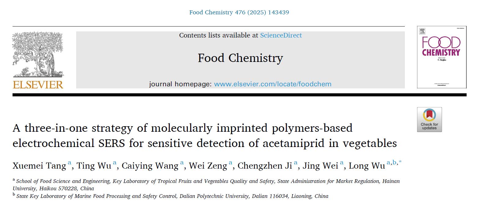 本期用户速递,海南大学食品科学与工程学院吴龙团队联合大连工业大学,在《Food Chemistry》发表“ A three-in-one strategy of molecularly imprinted polymers-based electrochemical SERS for sensitive detection of acetamiprid in vegetables”研究论文,提出提出“分子印迹捕获-电化学调控-拉曼信号增强”三合一策略,构建分子印迹聚合物基电化学SERS(MIP-EC-SERS)传感器,重点通过基底设计与检测条件优化,解决传统SERS基质干扰、分子亲和力弱的问题。