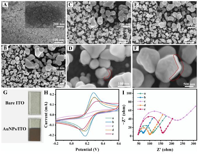 图2:裸ITO、AuNPs/ITO及不同状态MIP/AuNPs/ITO的SEM图像、电极外观图、CV曲线与EIS图谱