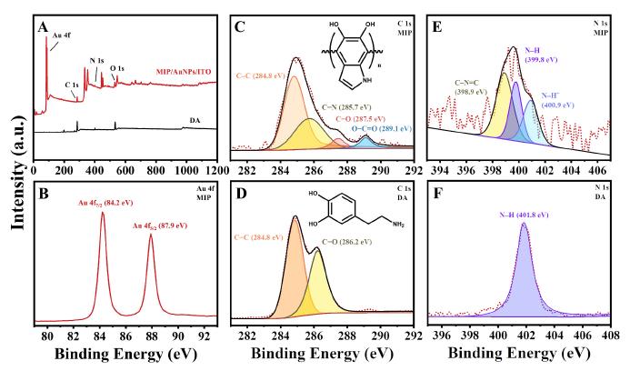 传感器的关键是MIP/AuNPs/ITO复合基底(图1):通过电化学沉积在ITO表面负载AuNPs形成初始SERS“热点”,再以多巴胺为单体、AAP为模板电聚合形成分子印迹层(MIP),层内掺杂的微小AuNPs进一步增加“热点”密度;洗脱模板后,MIP层的特异性空腔可将AAP富集到“热点”附近,实现拉曼信号第一次增强。XPS表征(图2)证实基底中金属态Au(Au4f7/2=84.2eV)与PDA官能团存在,为拉曼增强提供物质基础。