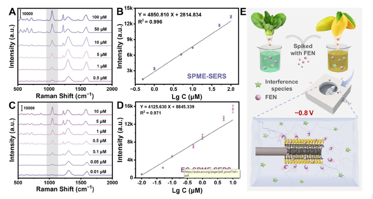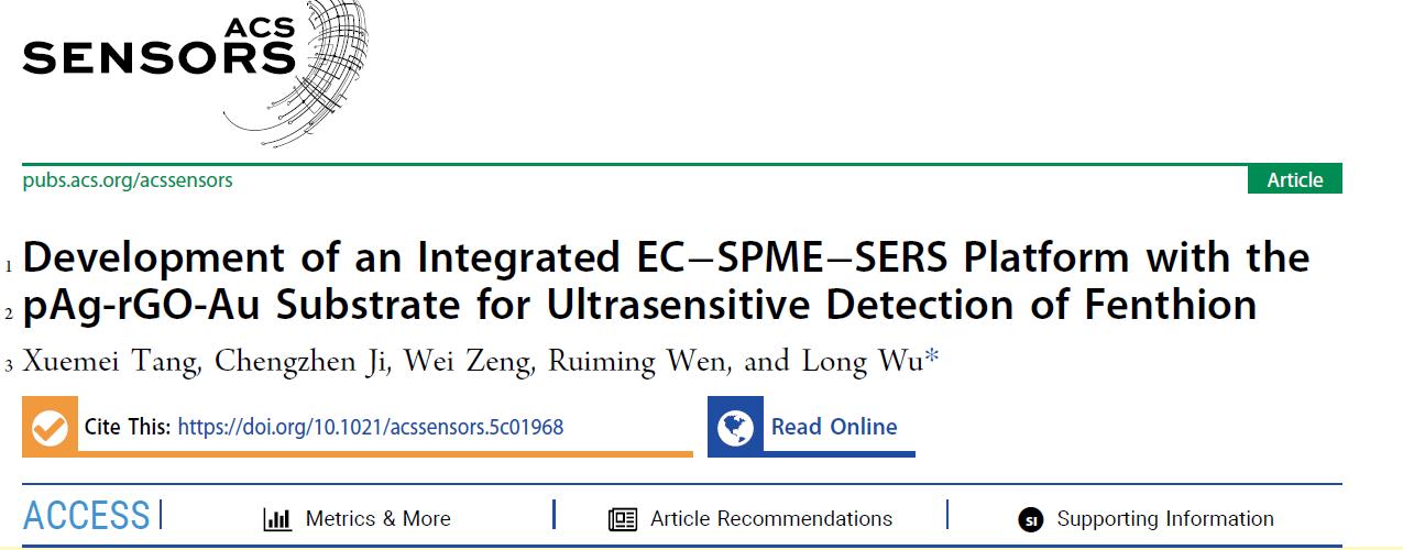 海南大学食品科学与工程学院吴龙团队联合相关单位,在《ACSSensors》发表Development of an Integrated EC−SPME−SERS Platform with the pAg-rGO-Au Substrate for Ultrasensitive Detection of Fenthion研究论文,创新性开发出基于pAg-rGO-Au复合基底的EC-SPME-SERS集成检测平台,专门用于食品中倍硫磷(FEN)农药残留的超灵敏检测。该平台整合电化学(EC)调控、固相微萃取(SPME)富集与表面增强拉曼散射(SERS)检测功能,解决了传统SERS检测中基质干扰强、目标分子富集难的问题,检出限低至2.7nM,较传统SPME-SERS灵敏度提升30倍,为复杂食品基质中痕量污染物检测提供了高效技术方案。