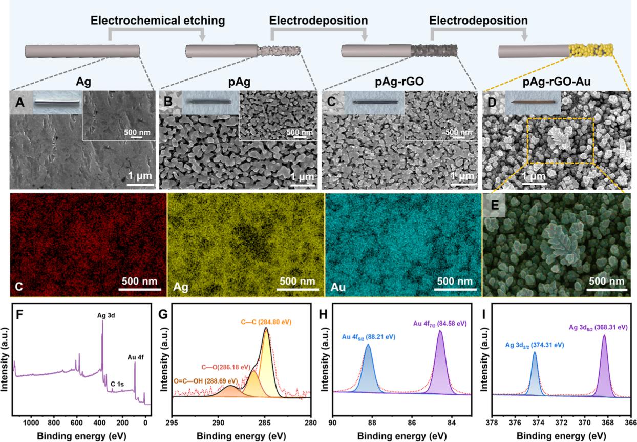 图1:(A)Ag丝、(B)pAg、(C)pAg-rGO、(D)pAg-rGO-Au的SEM图像(插图为实物照片);(E)pAg-rGO-Au的EDS元素mapping;(F)XPS全谱;(G-I)C1s、Au4f、Ag3d高分辨XPS光谱。